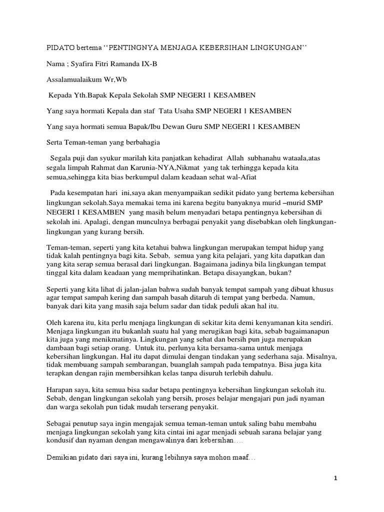 Salah satu tema yang biasa dijadikan dasar atau pengarahan yaitu pidato tentang kebersihan . Siswa untuk menjaga kebersihan di lingkungan sekolahnya. Kebersihan lingkungan assalamualaikum wr.wb yang terhormat bapak kepala sekolah sma negeri 5 surakarta, yang saya hormati bapak . Perkenankanlah saya menyampaikan sebuah pidato tentang pentingnya menjaga kebersihan lingkungan sekolah. 9apembacaan teks pidato persuasif'pentingnya menjaga kebersihan lingkungan sekolah'